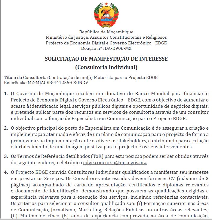 - O Projecto EDGE convida Consultores Individuais qualificados a manifestar seu interesse em prestar os Serviços. Os Consultores interessados devem fornecer CV (máximo de 3 páginas) acompanhado de carta de apresentação, certificados e diplomas relevantes e documento de identificação, demonstrando que possuem as qualificações exigidas e experiência relevante para a execução dos serviços, incluindo referências contactáveis. Os critérios para selecionar o consultor qualificado são: (i) Formação superior nas áreas de Comunicação, Jornalismo, Marketing, Relações Públicas ou outras áreas relevantes; (ii) Mínimo de cinco (5) anos de experiência comprovada na área de comunicação marketing e planeamento de estratégias de comunicação; (iii) Experiência comprovada na implementação de campanhas publicitárias; (iv) Experiência comprovada na área de Artes Gráficas e Audiovisuais; (v) Experiência em comunicação oral e escrita eficaz, incluindo o desenvolvimento de produtos de comunicação: (vi) O consultor não deve estar vinculado numa instituição estatal.